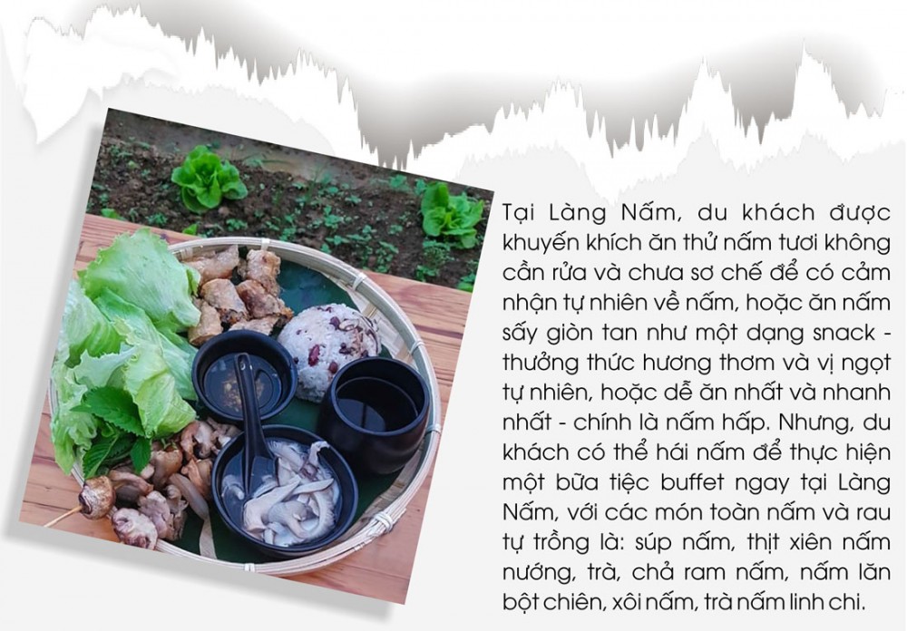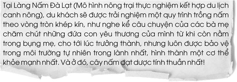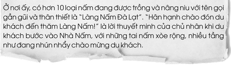 Một trong những điểm tham quan mới lạ nhất của thành phố ngàn hoa Đà Lạt (Lâm Đồng) là Làng Nấm Đà Lạt. Được nghe giới thiệu từng vòng đời sinh trưởng của hơn 10 loại nấm quý khác nhau và thưởng thức buffer nấm đậm đà hương vị ngọt bùi thực sự là một trải nghiệm độc đáo và thú vị.