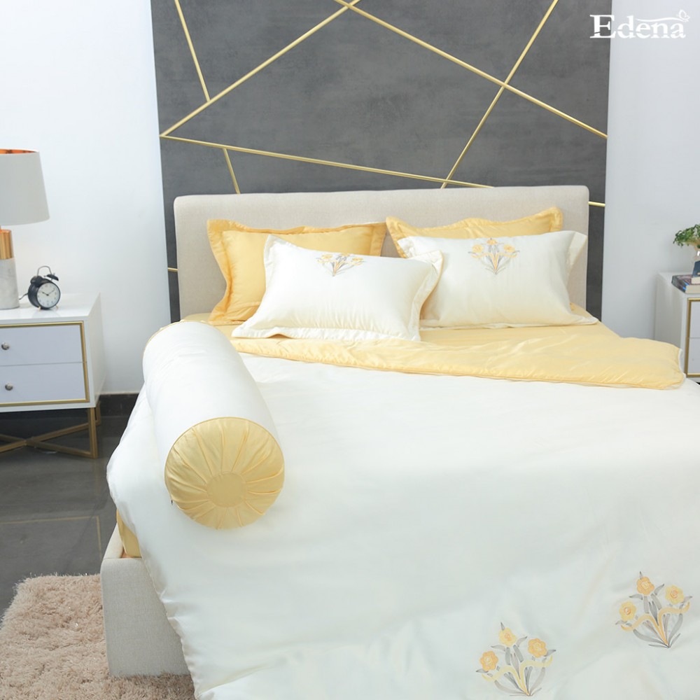 Trọn bộ ra giường tông trắng phối vàng chất liệu Tencel chỉ 2.990.000 đồng