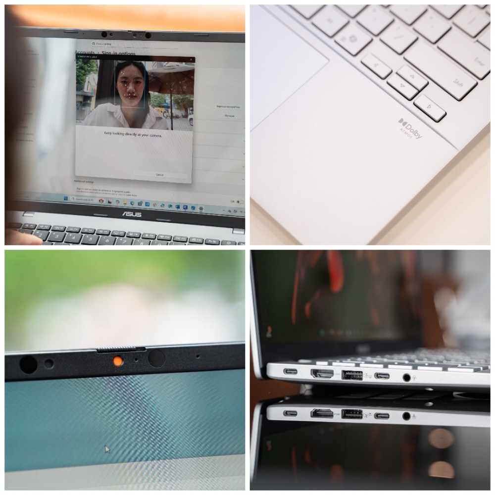 Một số trang bị trên cả hai phiên bản Vivobook S14/S16 chip Snapdragon™ X và AMD Ryzen™ AI: Webcam IR hỗ trợ nhận diện khuôn mặt, nắp che webcam vật lý, hệ thống loa hỗ trợ chuẩn Dolby Atmos và cổng kết nối đa dạng.